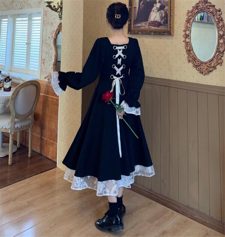 百掛け 長袖 レース スクエアネック ブラック ワンピース ロングセクション 大きいサイズ